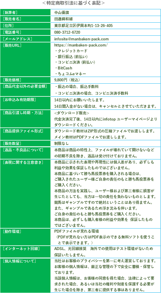折り返し商品( 万馬券的中マニュアル、万馬券の巻物、GⅠ万馬券、GⅡ万馬券、GⅢ万馬券、万馬券ジョッキー、万馬券シークレットファイル、万馬券的中書~馬券購入ブック~+万馬券メールサポートサービス)の全てをご提供いたします。